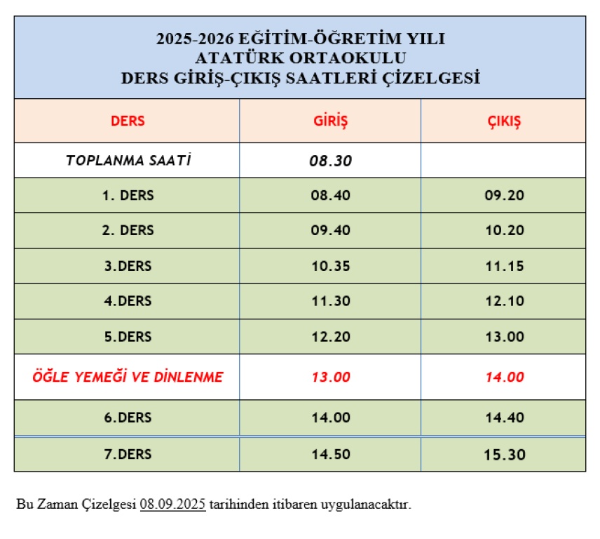 2025-2026 Eğitim-Öğretim yılı Atatürk Ortaokulu ders giriş-çıkış saatleri çizelgesi aşağıda sunulmuştur.